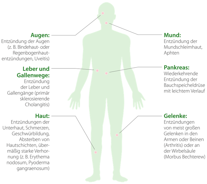 Nicht alle Symptome der Colitis ulcerosa betreffen den Darm direkt. Bei einigen der Betroffenen treten sogenannte extraintestinale Manifestationen auf – also entzündliche Beschwerden außerhalb des Verdauungstrakts. Dazu gehören unter anderem Gelenkschmerzen, Augenentzündungen oder Hautveränderungen, etwa schmerzhafte Knoten an den Unterschenkeln. Auch die Leber oder die Gallengänge können betroffen sein. Solche Beschwerden treten häufig während aktiver Schübe auf, können aber auch unabhängig von der Darmentzündung bestehen bleiben.