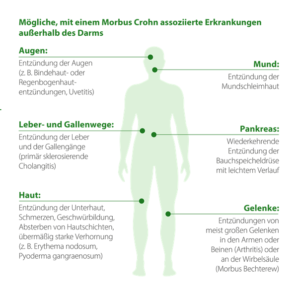Solche Begleiterscheinungen sind nicht bei allen Patientinnen und Patienten gleich ausgeprägt. Sie können dem Darmschub vorausgehen, gleichzeitig mit ihm auftreten oder auch unabhängig davon bestehen bleiben.