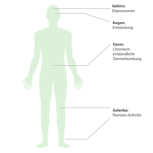 Bei bis zu 30 Prozent der Betroffenen greift die Entzündung auch auf die Gelenke über, was als Psoriasis-Arthritis bezeichnet wird. Diese äußert sich durch Gelenkschmerzen, Schwellungen und eine morgendliche Steifigkeit, die vor allem die Finger- und Zehengelenke, aber auch Knie, Hüfte oder die Wirbelsäule betreffen kann. Da eine unbehandelte Psoriasis-Arthritis zu dauerhaften Gelenkschäden führen kann, ist es besonders wichtig, Gelenkbeschwerden frühzeitig beim Arzt anzusprechen. Wie Ihr Arzt eine sichere Diagnose stellt, lesen Sie hier.