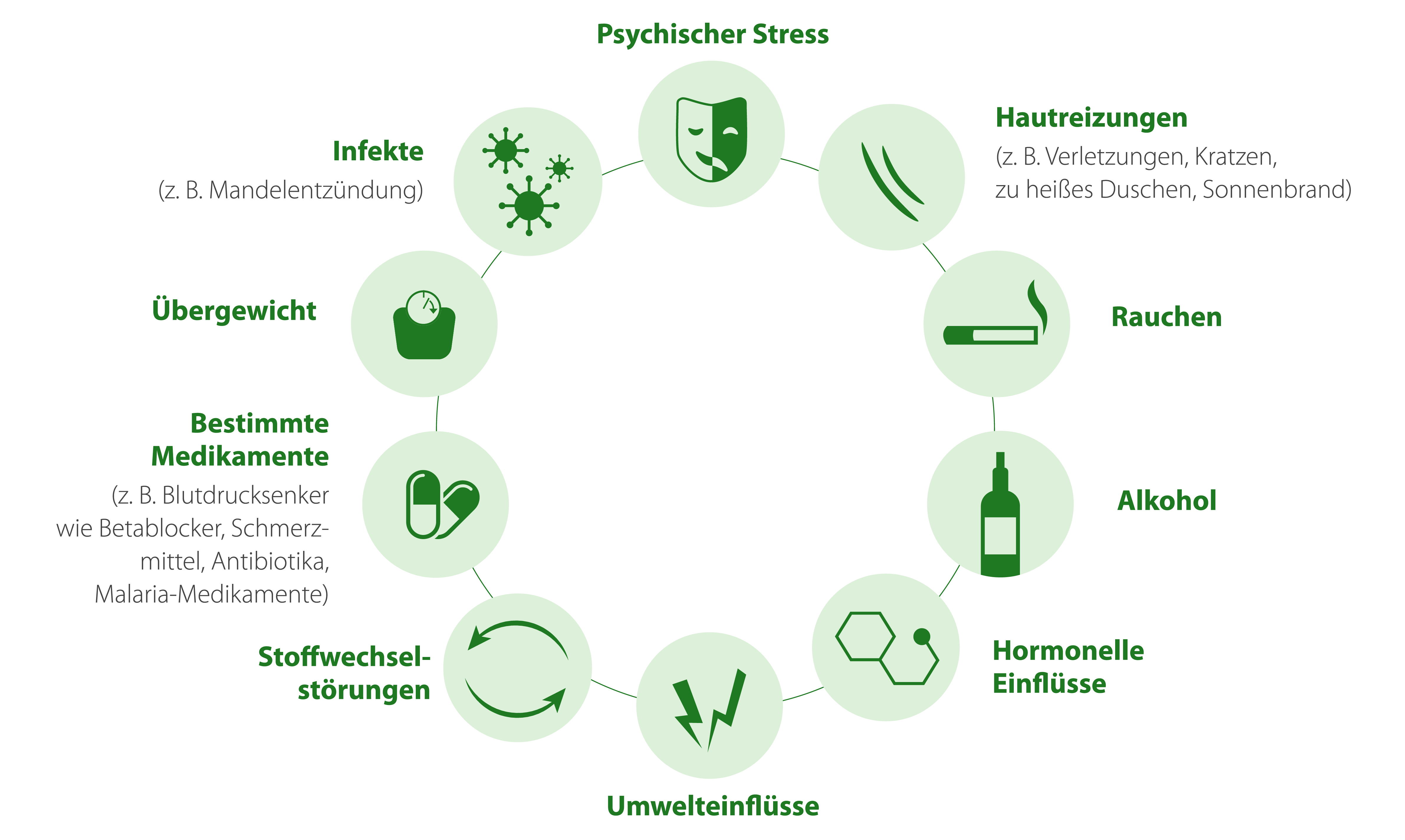 Damit eine Schuppenflechte erstmals auftritt oder ein neuer Schub ausgelöst wird, sind häufig bestimmte Triggerfaktoren verantwortlich. Zu den häufigsten Auslösern zählen Infektionskrankheiten wie eine Mandelentzündung durch Streptokokken sowie starker emotionaler Stress. Auch mechanische Reize der Haut – wie Verletzungen, Kratzer, Sonnenbrand oder Tattoos – können neue Psoriasis-Herde verursachen. Dieses Phänomen wird Köbner-Phänomen genannt. Darüber hinaus können bestimmte Medikamente, übermäßiger Alkoholkonsum, Rauchen und hormonelle Umstellungen die Erkrankung beeinflussen.